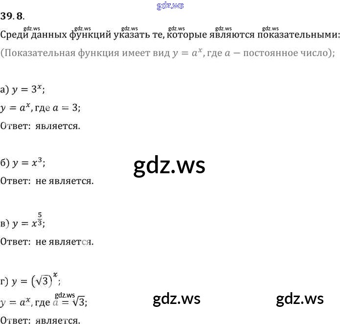 Готовый и полный ответ к §39. Показательная функция, ее свойства и график Глава 7 - Алгебре 11 класс Мордкович Задачник Базовый уровень ФГОС