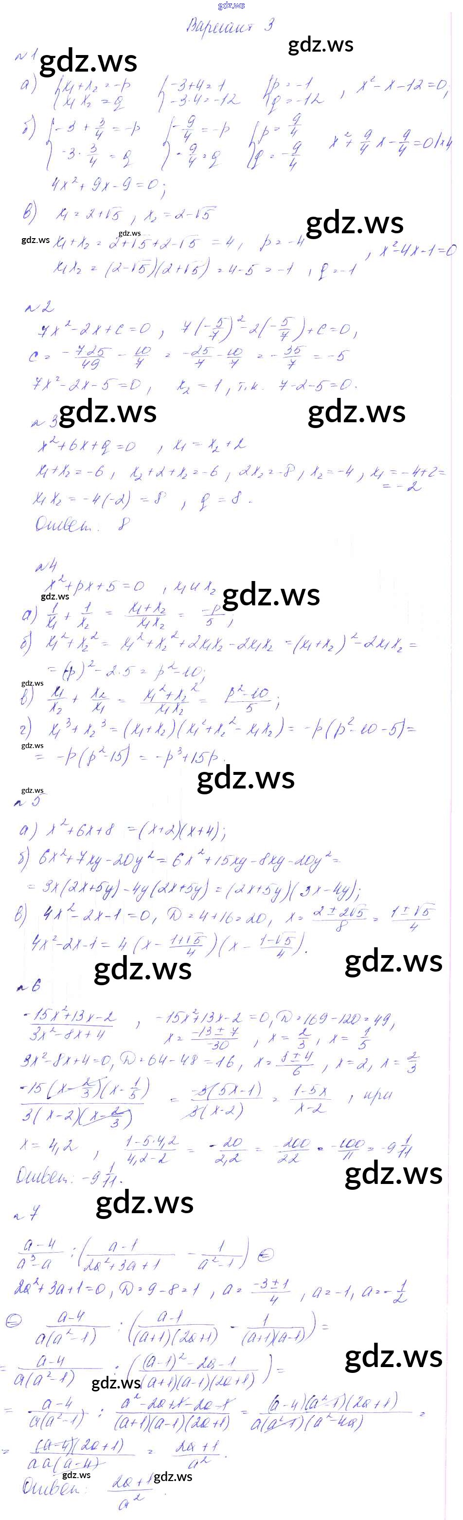 Готовый и полный ответ к СР-15. Свойство корней квадратного уравнения, симметрические многочлены, разложение квадратного трехчлена на множ Самостоятельные работы - Алгебре 8 класс Феоктистов Дидактические материалы ФГОС