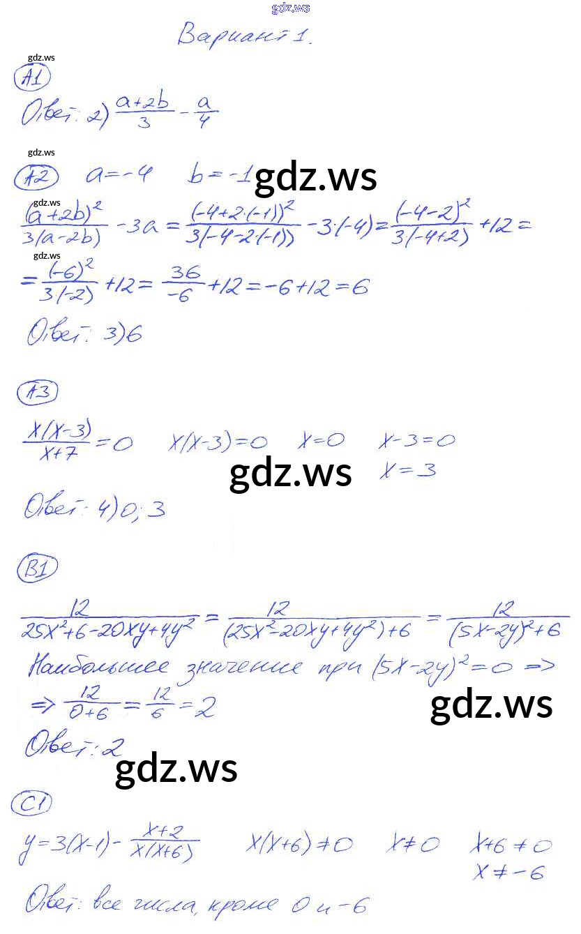 Готовый и полный ответ к СР-1. Варианты Cамостоятельные работы - Алгебре 8 класс Глазков Самостоятельные и контрольные работы УМК ФГОС