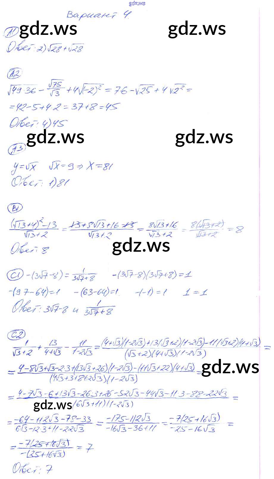 Готовый и полный ответ к КР-4. Варианты Контрольные работы - Алгебре 8 класс Глазков Самостоятельные и контрольные работы УМК ФГОС