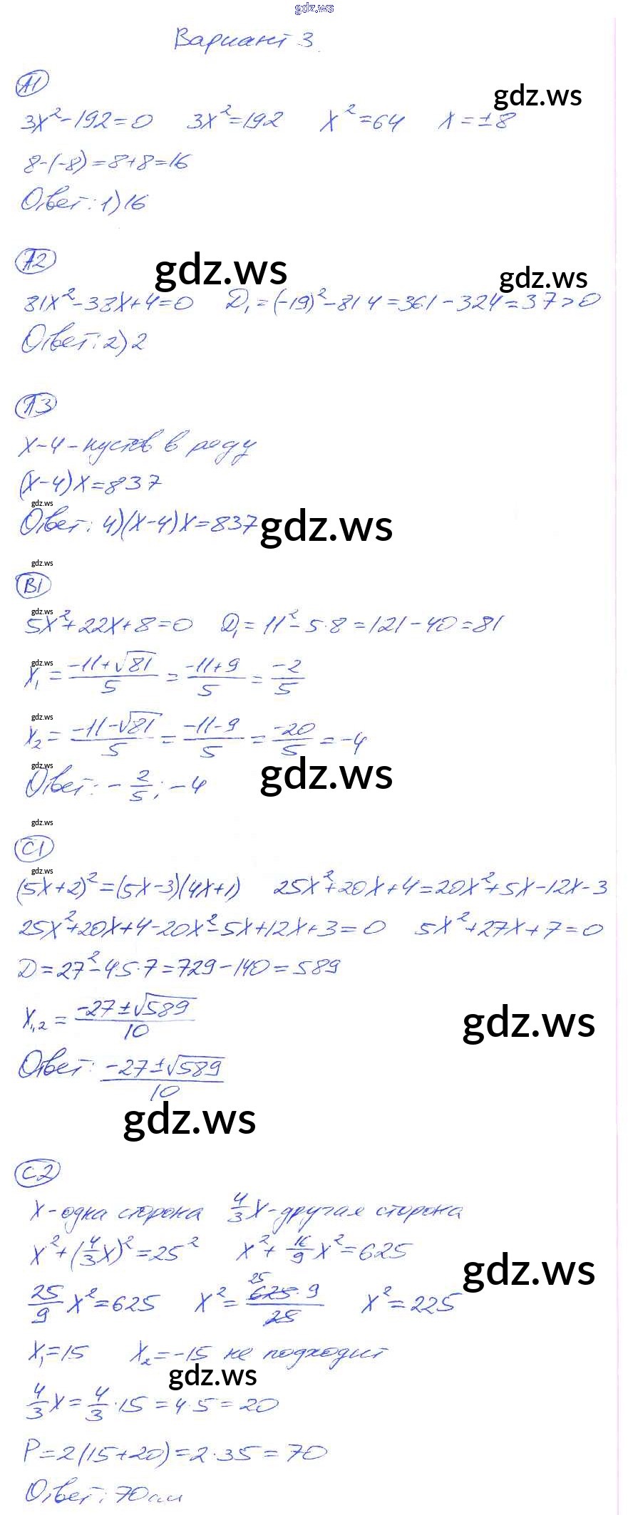 Готовый и полный ответ к КР-5. Варианты Контрольные работы - Алгебре 8 класс Глазков Самостоятельные и контрольные работы УМК ФГОС
