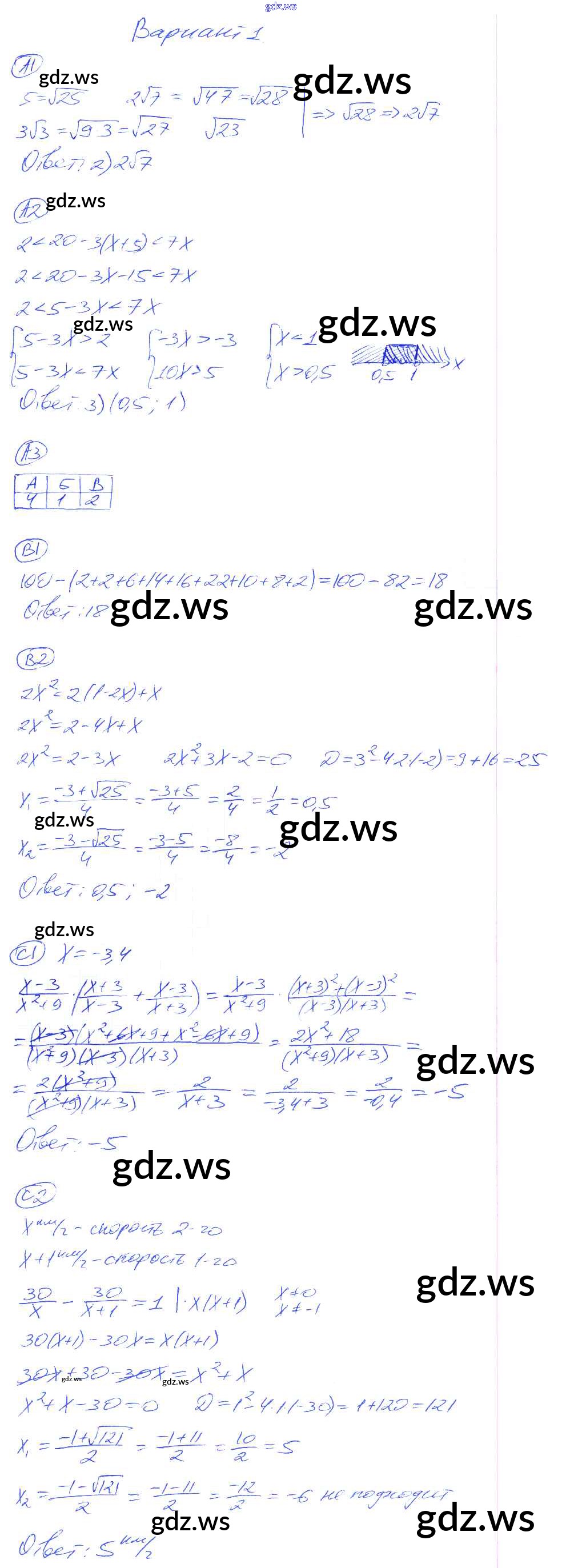 Готовый и полный ответ к КР-9. Варианты Контрольные работы - Алгебре 8 класс Глазков Самостоятельные и контрольные работы УМК ФГОС