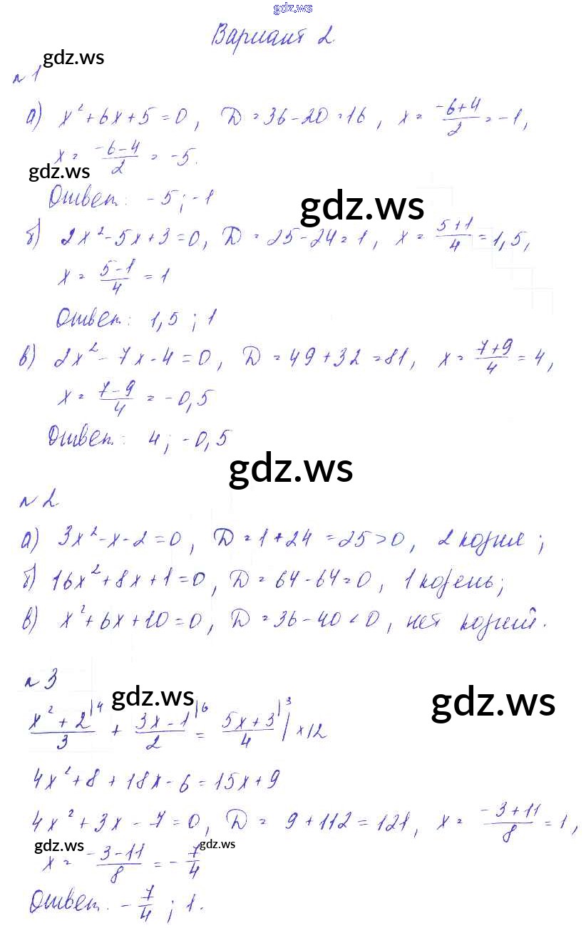 Готовый и полный ответ к СР №10. Решение квадратных уравнений Самостоятельные работы - Алгебре 8 класс Зив Дидактические материалы ФГОС