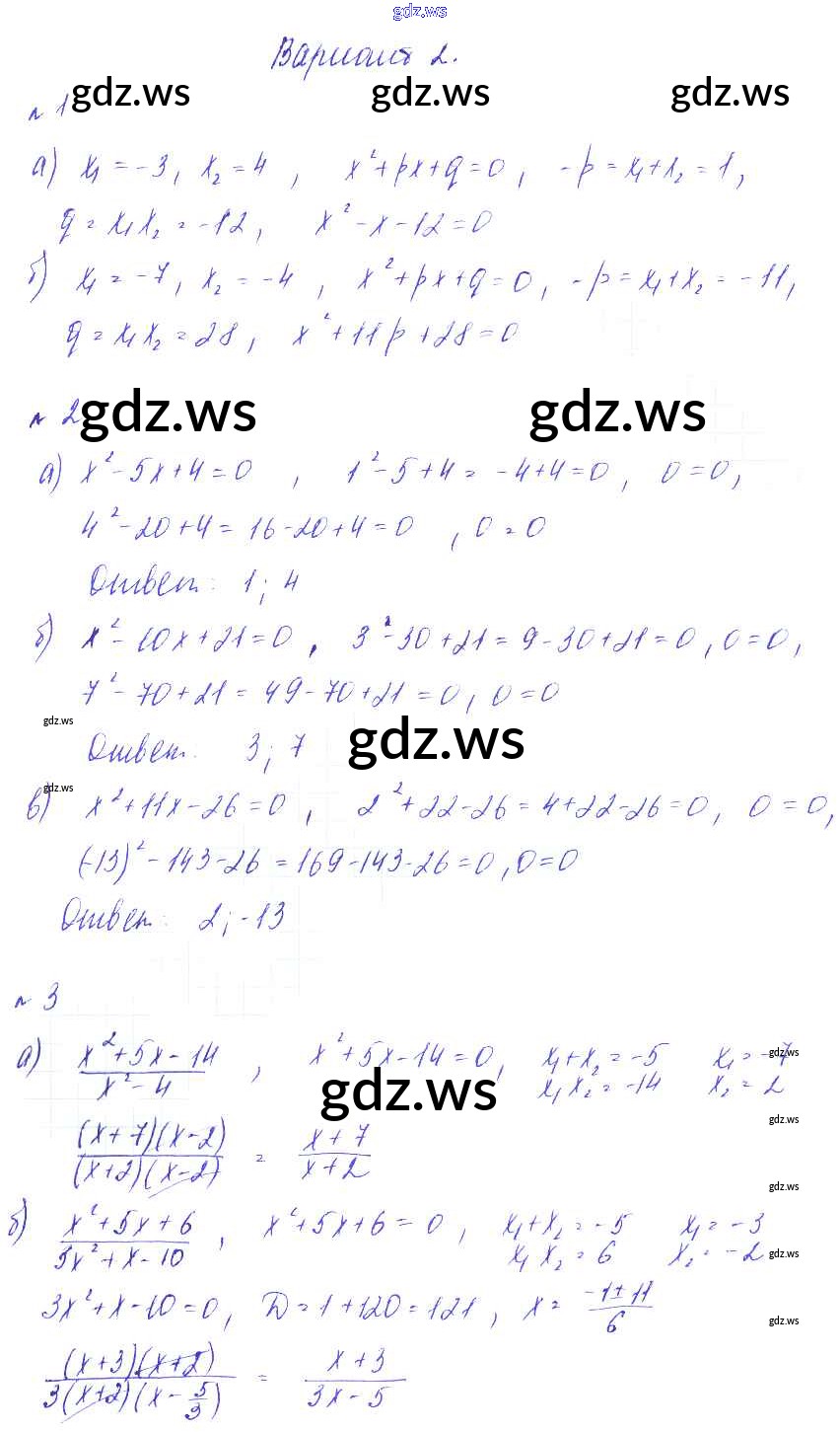 Готовый и полный ответ к СР №11. Теорема Виета Самостоятельные работы - Алгебре 8 класс Зив Дидактические материалы ФГОС