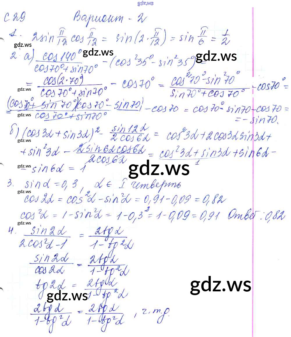Готовый и полный ответ к С-29. Формулы двойного угла Самостоятельные работы - Алгебре 9 класс Журавлев Контрольные и самостоятельные работы УМК ФГОС