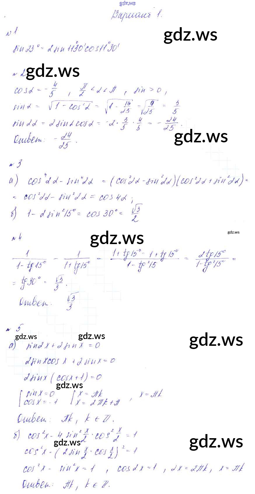 Готовый и полный ответ к СР-15. Синус и косинус двойного угла Самостоятельные работы - Алгебре 9 класс Зив Дидактические материалы ФГОС