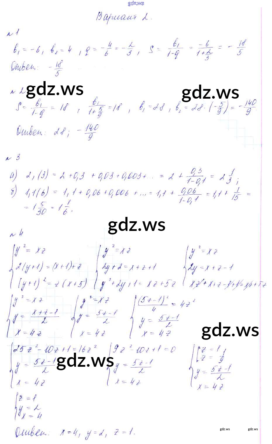Готовый и полный ответ к СР-19. Бесконечно убывающая геометрическая прогрессия. Смешанные задачи на прогрессии Самостоятельные работы - Алгебре 9 класс Зив Дидактические материалы ФГОС
