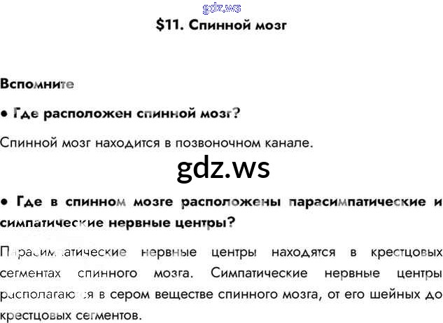 Готовый и полный ответ к §11. Спинной мозг Глава 2. Регуляторные системы организма - Биологии 8 класс Драгомилов Учебник Алгоритм успеха ФГОС