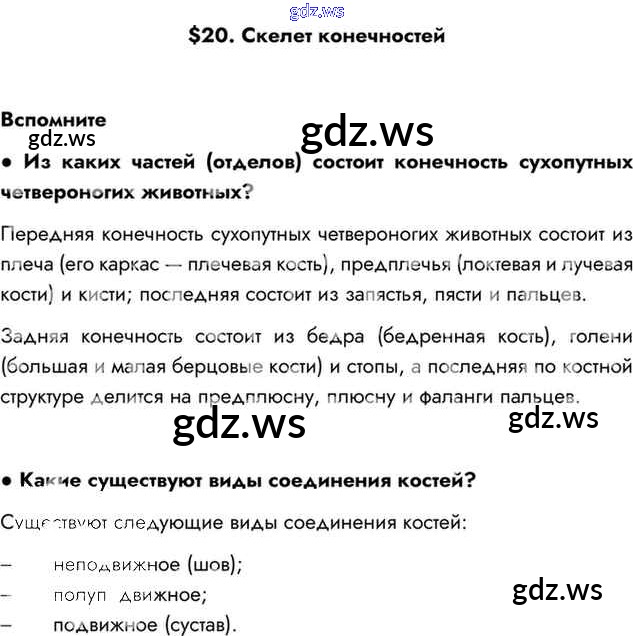 Готовый и полный ответ к §20. Скелет конечностей Глава 4. Опорно-двигательная система - Биологии 8 класс Драгомилов Учебник Алгоритм успеха ФГОС