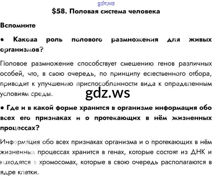 Готовый и полный ответ к §58. Половая система человека Глава 11. Индивидуальное развитие организма - Биологии 8 класс Драгомилов Учебник Алгоритм успеха ФГОС