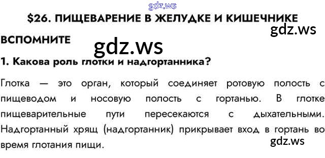 Готовый ответ Вспомните §26. Пищеварение в желудке и кишечнике - Биологии 8 класс Пасечник Учебник Линия жизни ФГОС