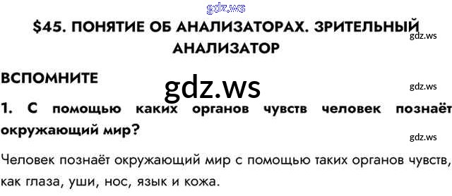 Готовый ответ Вспомните §45. Понятие об анализаторах. Зрительный анализатор - Биологии 8 класс Пасечник Учебник Линия жизни ФГОС