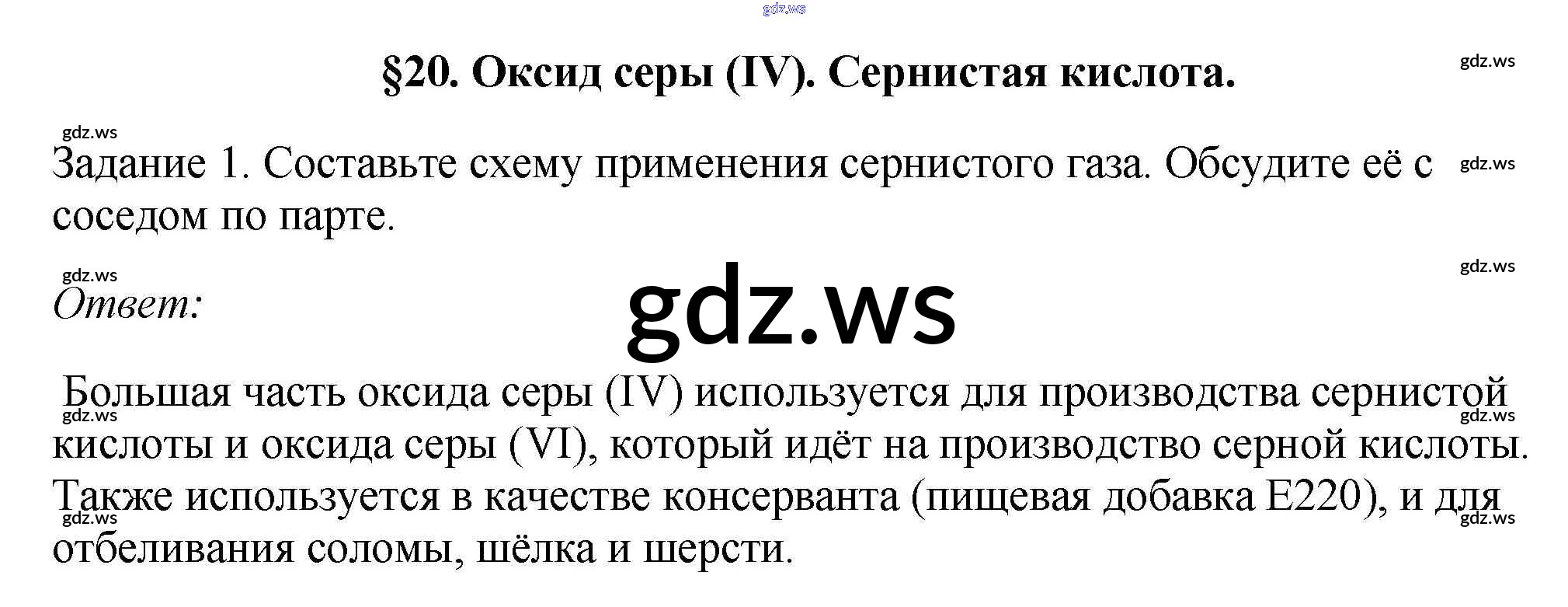 Готовый и полный ответ к § 20. Оксид серы (IV). Сернистая кислота Новое издание - Химии 9 класс Рудзитис Учебник УМК ФГОС