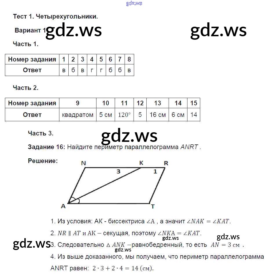 Готовый и полный ответ к Глава 1. Четырехугольники - Геометрии 8 класс Фарков Тесты УМК ФГОС