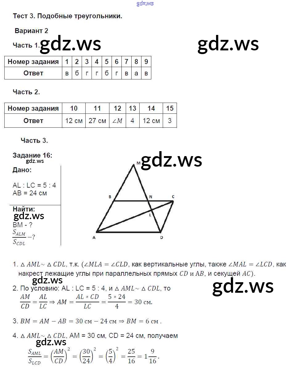 Готовый и полный ответ к Глава 3. Подобные треугольники - Геометрии 8 класс Фарков Тесты УМК ФГОС