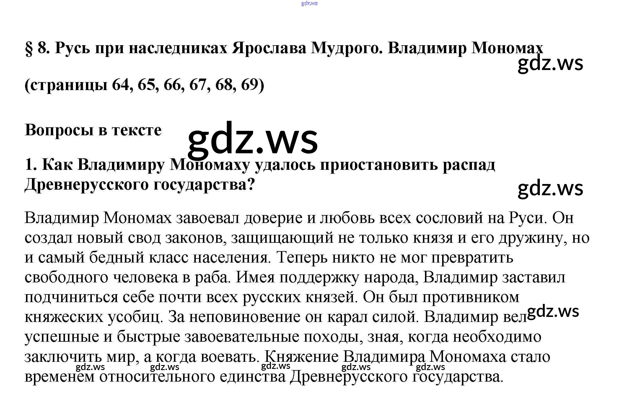 Готовый ответ Вопросы в тексте §8. Русь при наследниках Ярослава Мудрого. Владимир Мономах - Истории 6 класс Арсентьев Учебник ФГОС