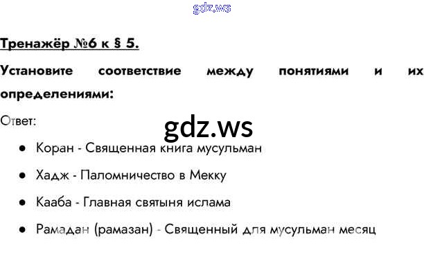 Готовый и полный ответ к Тренажёр §5. Мир ислама - Истории 6 класс Бойцов Учебник Инновационная школа ФГОС