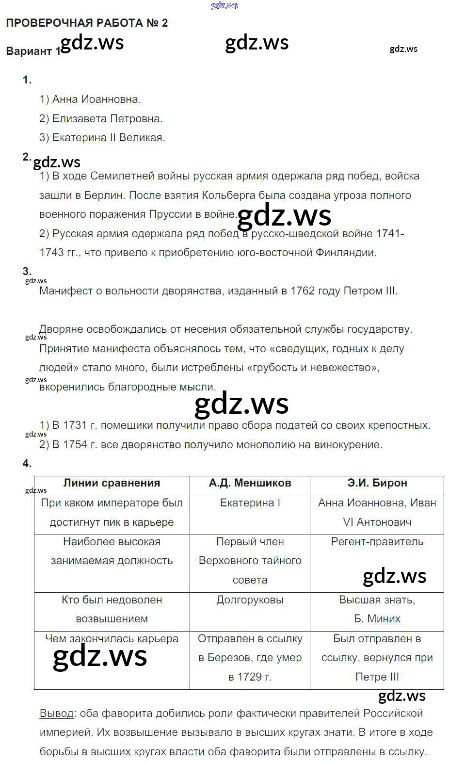 Готовый и полный ответ к Проверочная работа 2 Россия в 1725-1762 гг. - Истории 7 класс Артасов Тетрадь-экзаменатор Сферы ФГОС