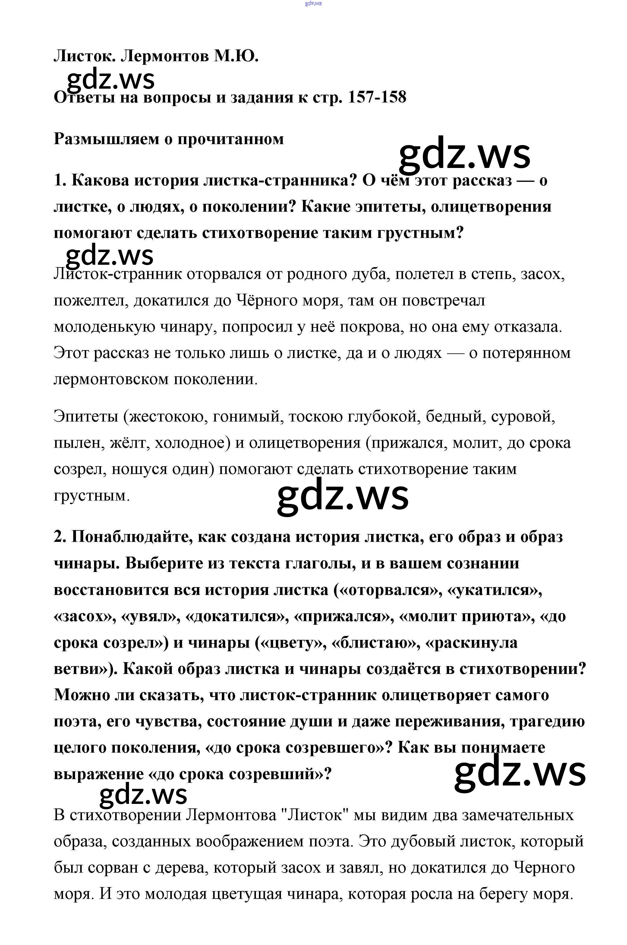 Готовый ответ Лермонтов Часть 1 (Новое 16-е издание) - Литературе 6 класс Полухина Учебник ФГОС