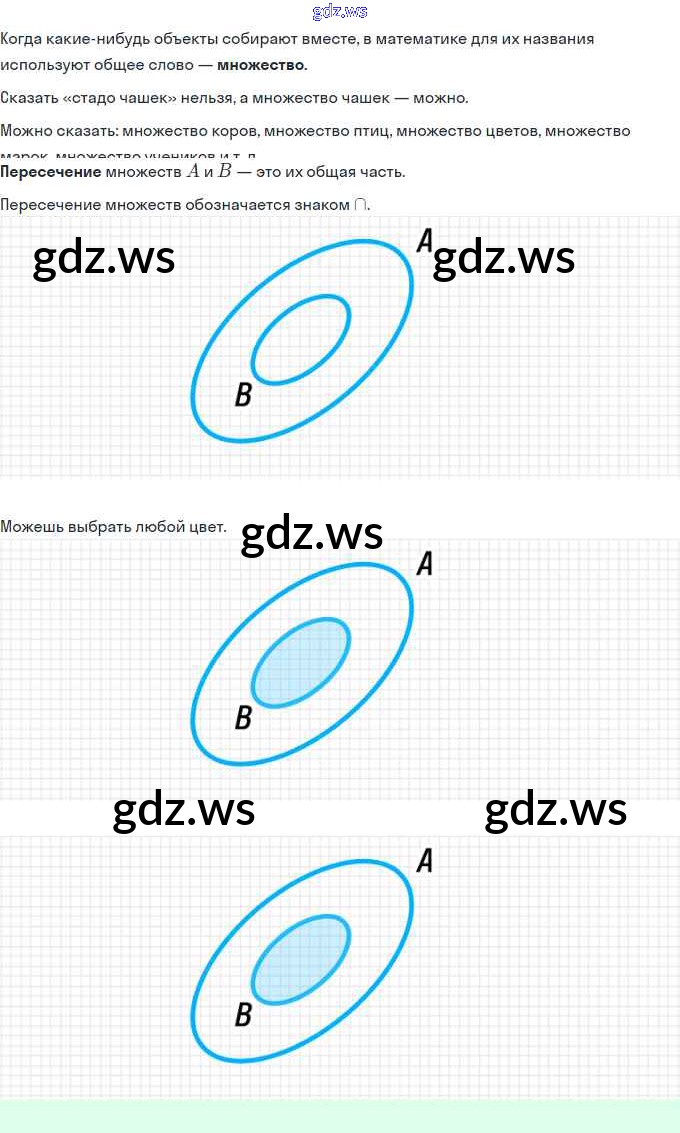 Готовый и полный ответ к Урок 10. Пересечение множеств. Знак ∩ Часть 1 - Математике 3 класс Петерсон Учебник Учусь учиться ФГОС