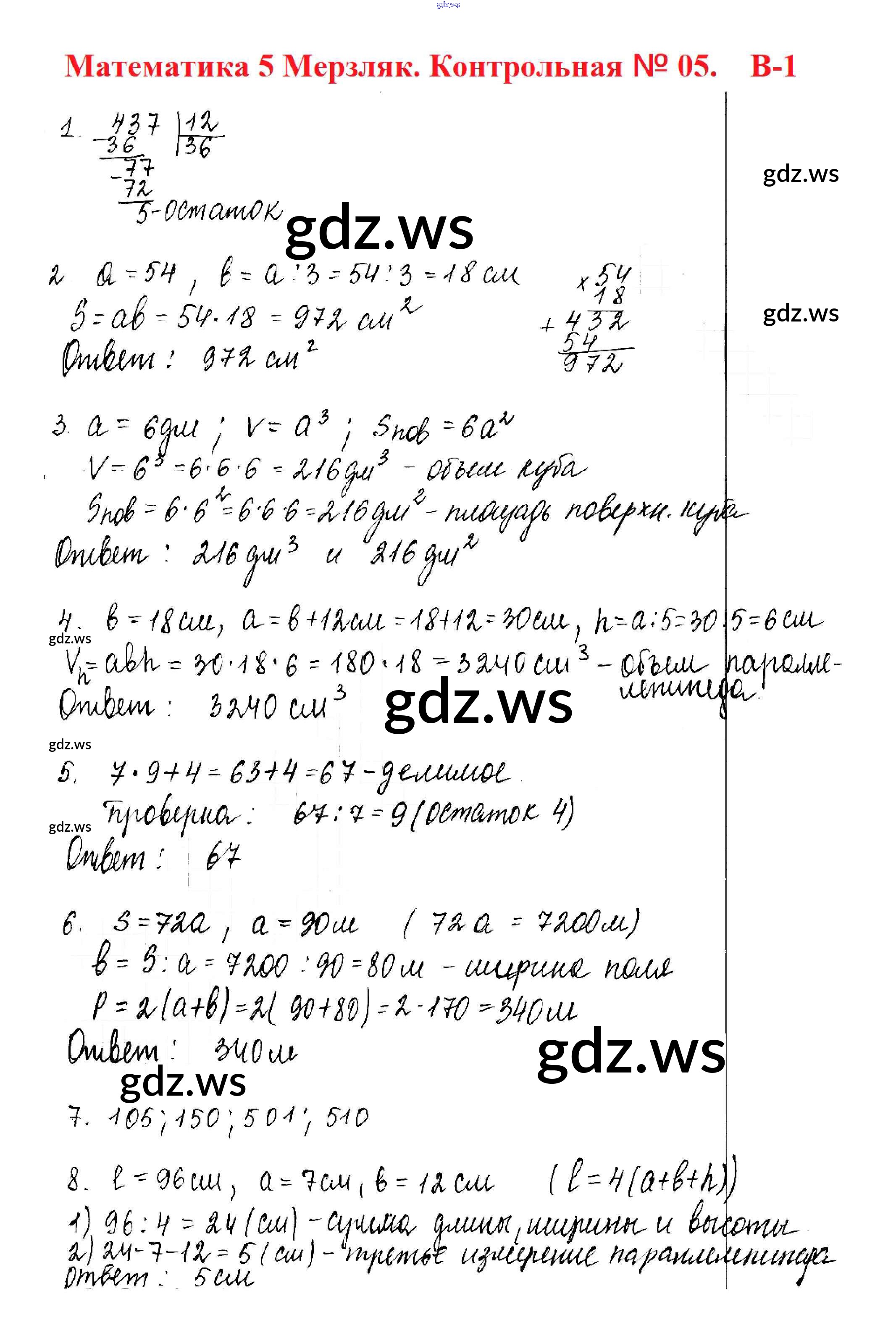 Готовый ответ КР №5. Деление с остатком. Площадь прямоугольника Контрольные работы - Математике 5 класс Мерзляк Дидактические материалы Алгоритм успеха ФГОС
