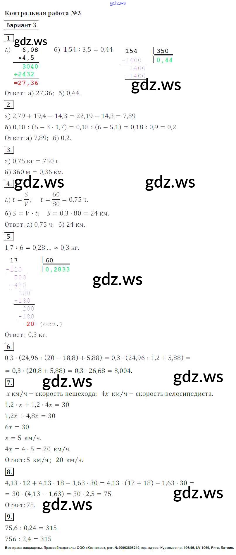Готовый ответ КР-3. Варианты - Математике 6 класс Кузнецова Контрольные работы ФГОС