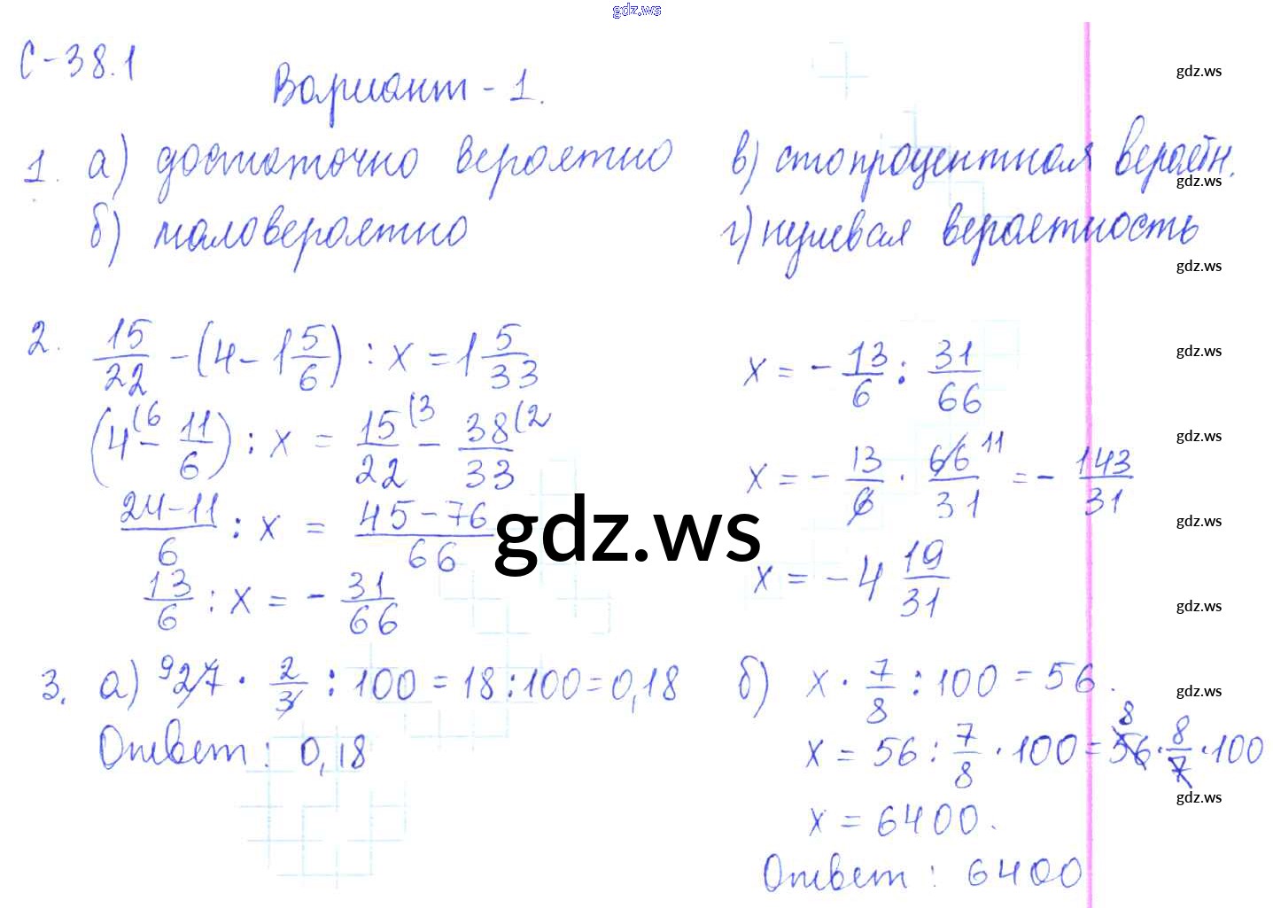 Готовый и полный ответ к 1. Варианты СР-38 - Математике 6 класс Зубарева Самостоятельные работы ФГОС