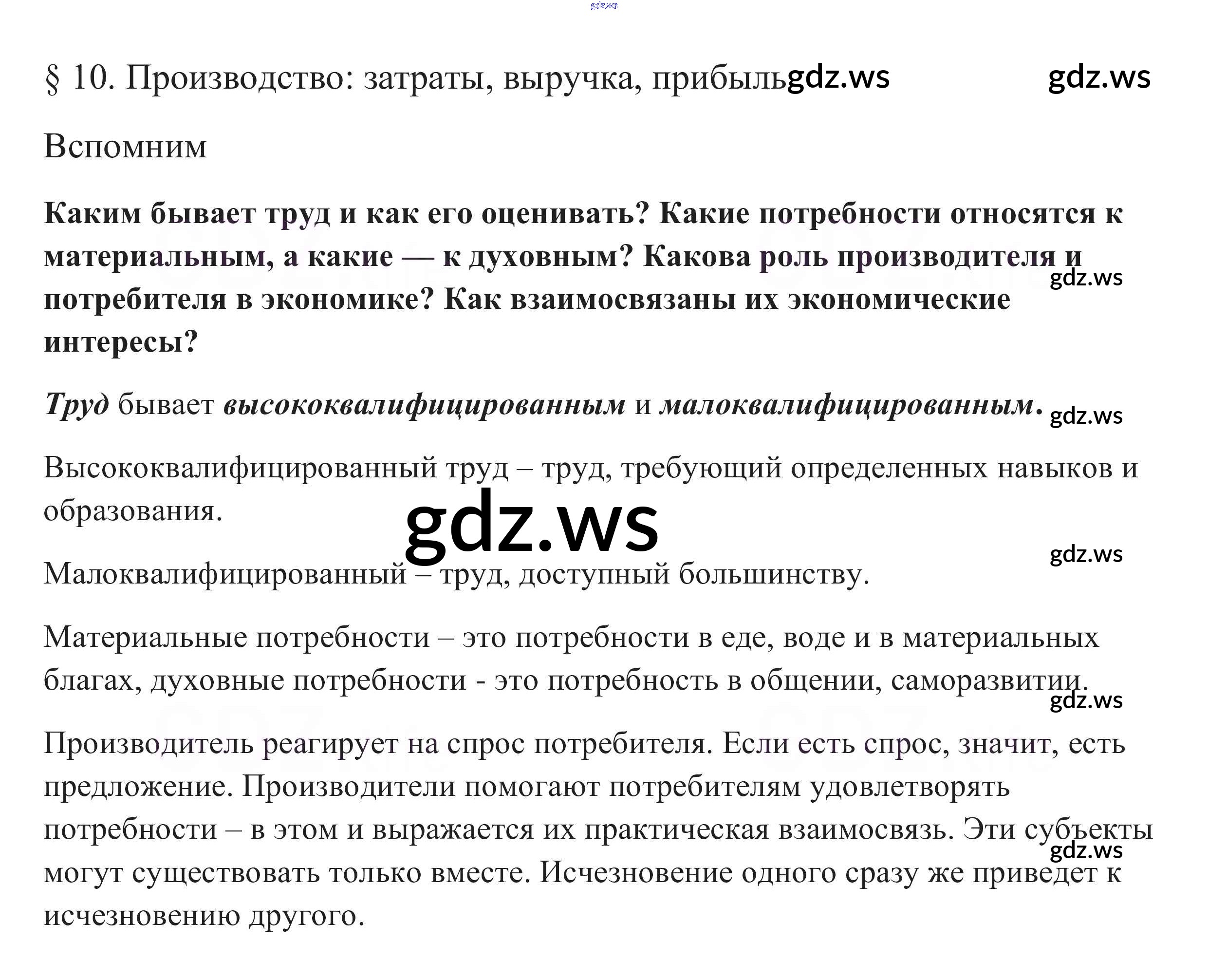 Готовый ответ Вспомним §10. Производство: затраты , выручка, прибыль - Обществознанию 7 класс Боголюбов Учебник Академический школьный учебник ФГОС