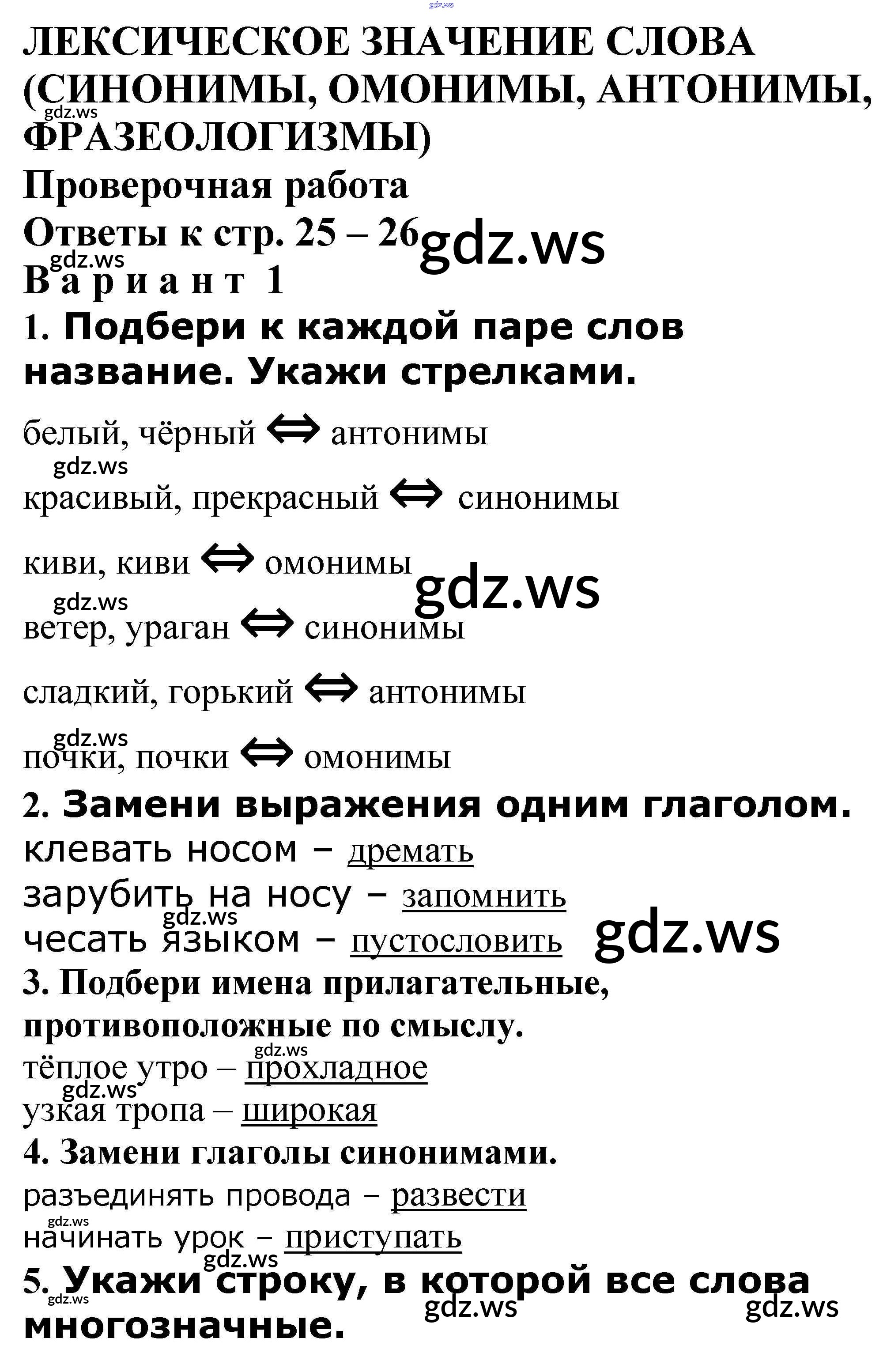 Готовый и полный ответ к Лексическое значение слова (синонимы, омонимы, антонимы, фразеологизмы) - Русскому языку 4 класс Максимова Проверочные и контрольные работы ФГОС